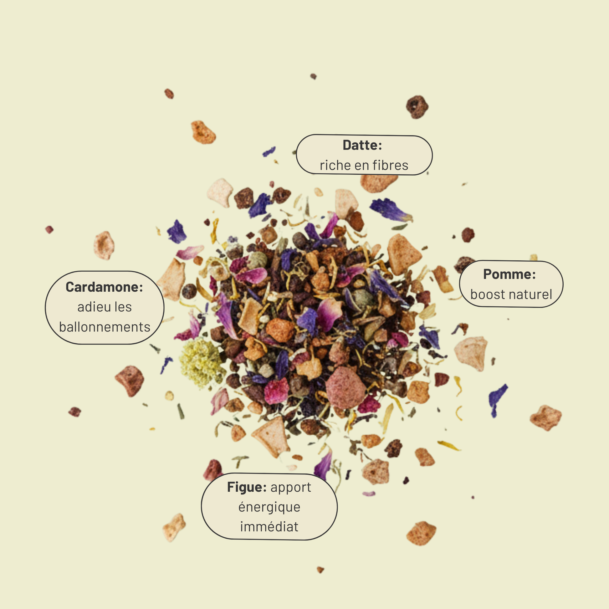 C'est 100% naturel ou bio. On utilise de vraies feuilles de thé (entières, pas de la poussière), de vrais morceaux de fruits, de vraies pétales et de vraies épices. Zéro arôme artificiel, zéro additif imprononçable. Ce que tu bois existe vraiment dans la nature.